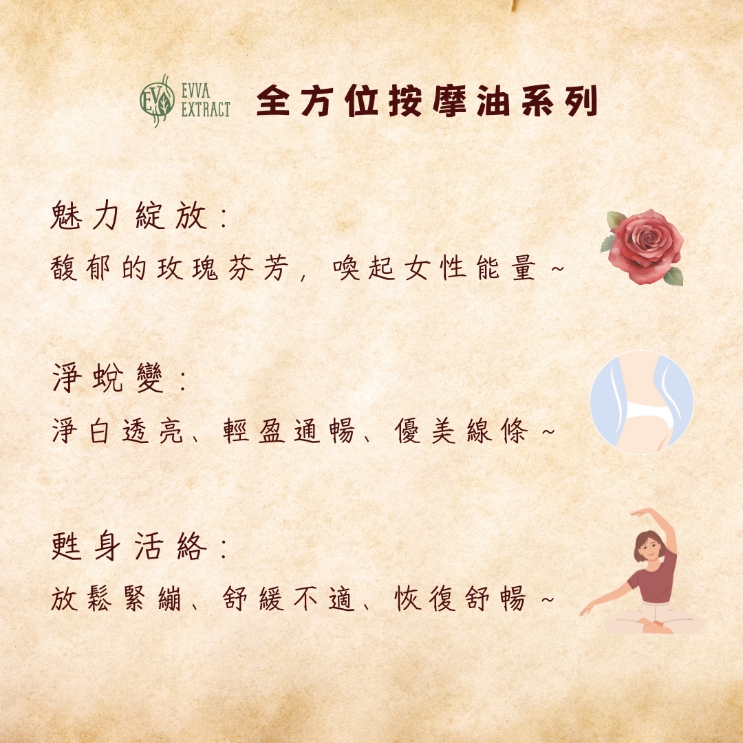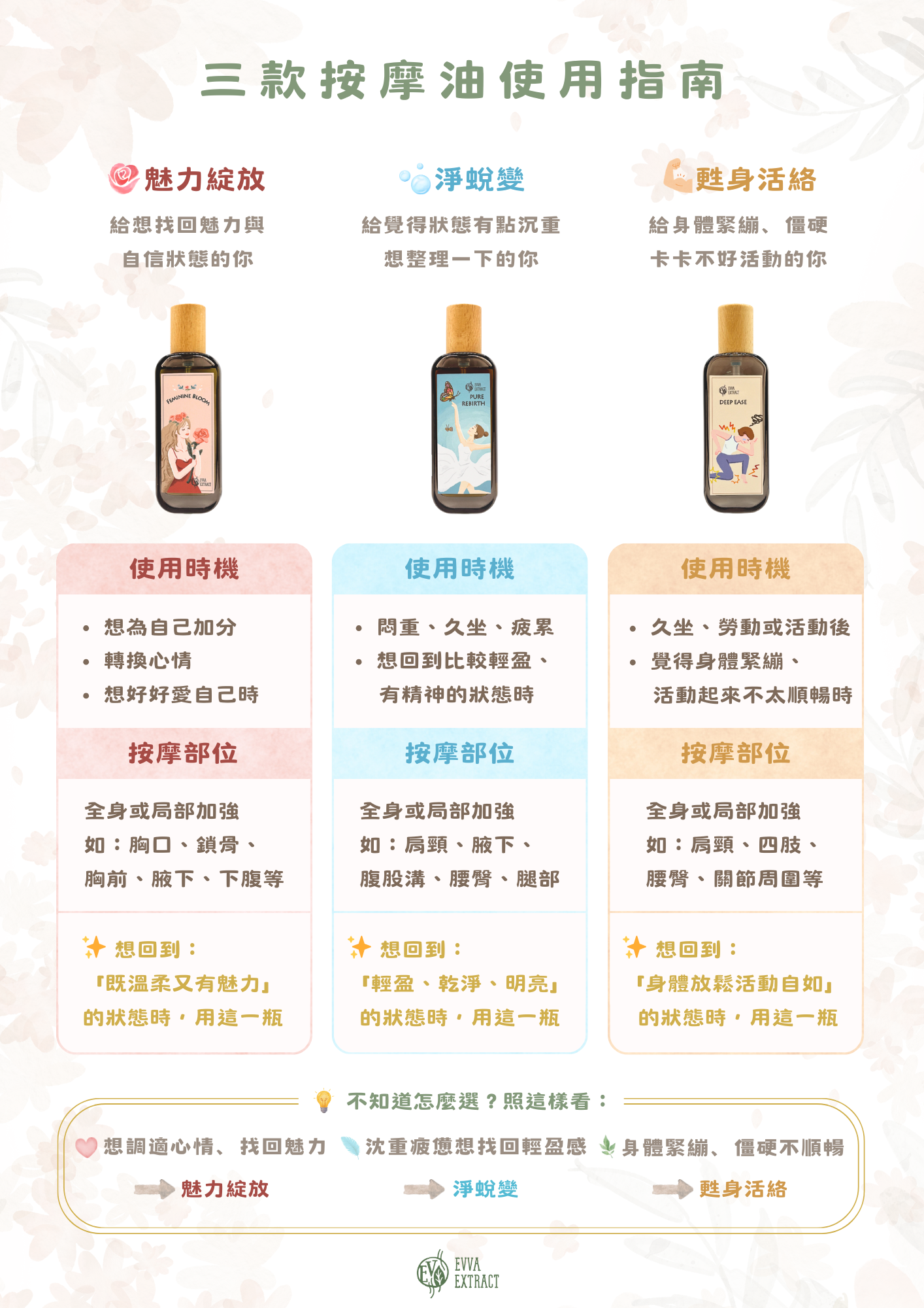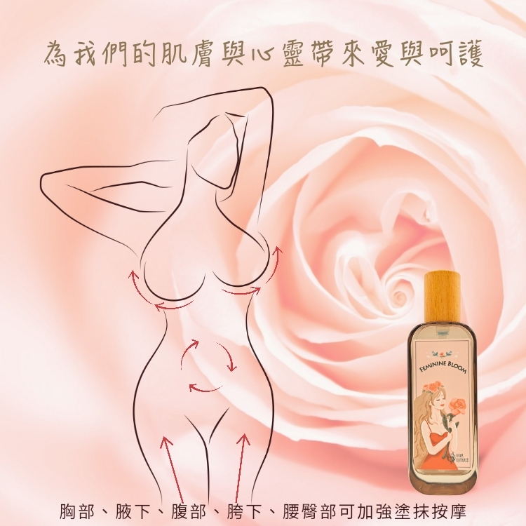 魅力綻放,是一款為想展現魅力、找回自信狀態所設計的複方按摩油。
