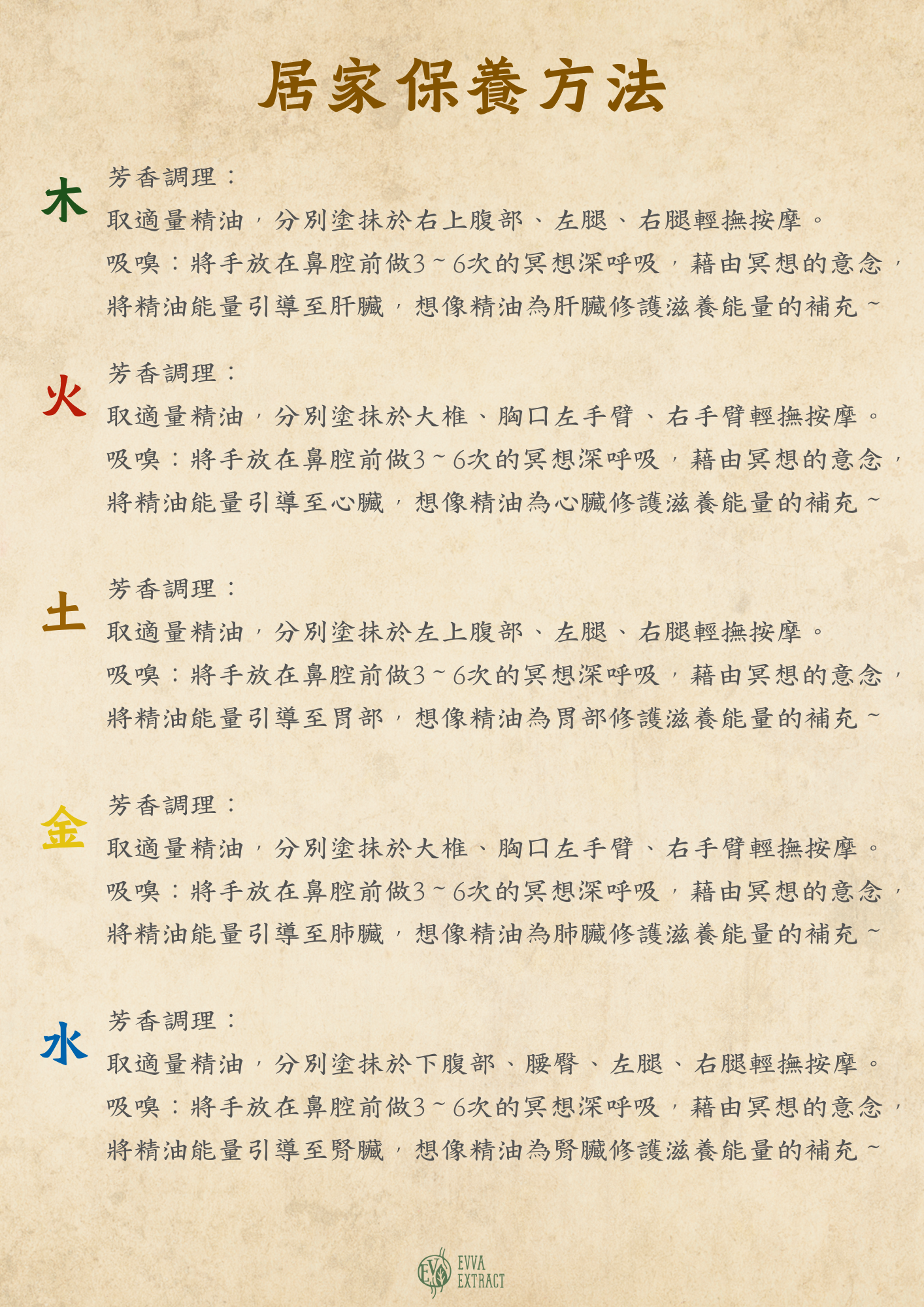 深度連結自然的和諧之美,讓身心融入天地共頻共振,綻放平衡、舒適、愉悅的生命能量。五行精油(木火土金水)蘊藏自然植物豐富能量,與身體頻率共振,輕觸心靈深處的未解情結。植物能量猶如微風拂過,喚醒因壓力而失序的韻律。一次次補充五行能量,滋養細胞記憶,調和平衡內在生命能量,讓行動、思維、情緒、愛與包容回歸和諧,讓身心靈充盈著希望與光芒。