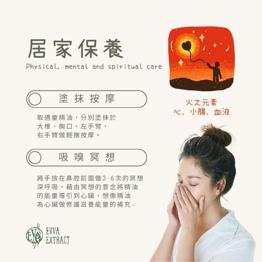 吸嗅:將手放在鼻腔前面做3-6次的冥想深呼吸,藉由冥想的意念,將精油的能量引導至心臟,想像精油為心臟做修護滋養能量的補充~